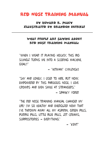 ![]() The The Red Nose Training Manual is the essential guide to using and enjoying a red nose. It includes beginning to advanced nose moves, simple guides about safety and etiquette, and even starter suggestions about career nose jobs. It's great for you or as an unforgettable gift for your friends. Enjoy these excerpts: ![]() Front Cover | Excerpt 1 | Excerpt 2 | Excerpt 3 | Back Cover |